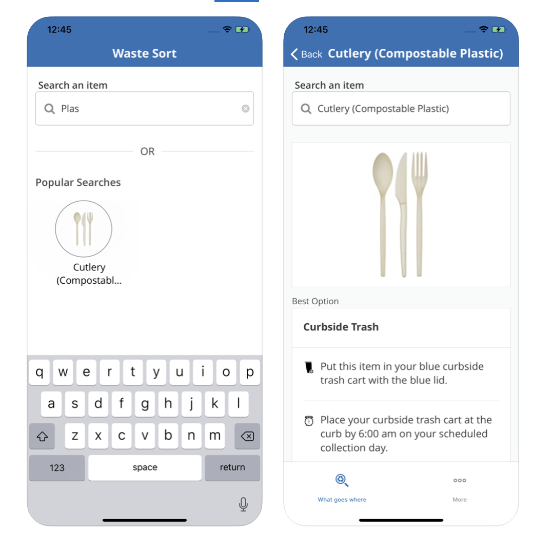 Also in the app or on our website, you can search the Waste Sort to find out if a material can be reused, donated, recycled, composted, or disposed of. Searching for items like rechargeable power drills, to aluminum foil, to old shirts is easy and a list of methods are provided for each item to make sure you dispose of your waste or other items properly.