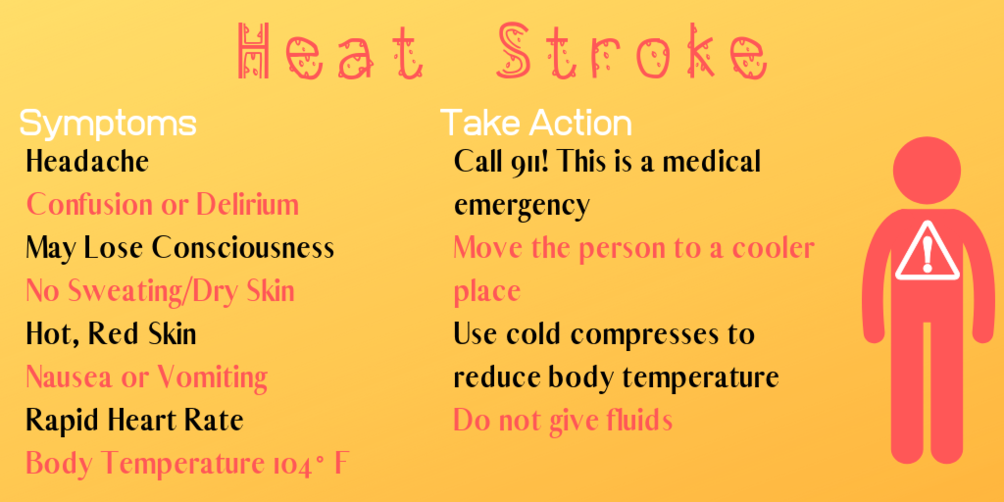 It's important to know the signs of heat-related illnesses and what to do. Heat exhaustion can lead to heat stroke if not treated. We cover both here, but heat cramps, sunburn, and heat rash are also heat-related illnesses. The Centers for Disease Control and Prevention has a lot of helpful information available regarding all heat-related illnesses.