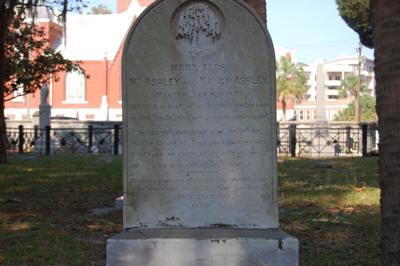 William and Nance Ashley's graves, are by far the most celebrated and one of the most curious of the interments at Oaklawn. William Ashley was a prominent white civic leader, serving as City Clerk. Nancy, the African-American servant who bore his surname, was also William's longtime companion and it was presumed also his wife outside the law. Following instructions left to William's executor John Jackson (another prominent white Tampan), the Ashley grave was opened to receive Nancy upon her death and, "to commemorate their fidelity in each other," a headstone was erected.