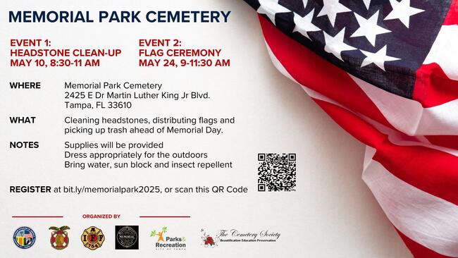 Also, in partnership with Keep Tampa Bay Beautiful and The Cemetery Society, clean-ups are scheduled at various cemetery locations throughout the year. If you are interested in volunteering, please contact The Cemetery Society.