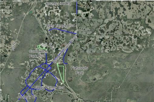 This seven-mile asphalt multi-purpose trail lies on the east side of Bruce B. Downs Boulevard. It offers access to commercial venues along Bruce B. Downs Boulevard as well as bridges and boardwalks over environmentally sensitive areas. Residents use neighborhood paths to link to the Bruce B. Downs Trail for access to Hillsborough County's Flatwoods Wilderness Park. The Amberly Drive Loop is 3.22 miles and the Tampa Palms Loop is 5.81 miles.