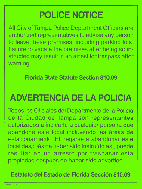 The Tampa Police Department implemented the Trespass Affidavit Program in an effort to assist business and / or property owners in the control of their property during non-business hours or their absence from the premises. When an owner has identified a recurring trespassing problem at his or her business or property, the owner or legal representative may request this service. The Trespass Affidavit gives any Tampa Police officer the right to act as the owner's representative in warning anyone found in violation of the affidavit to leave, and to arrest violators if they refuse.