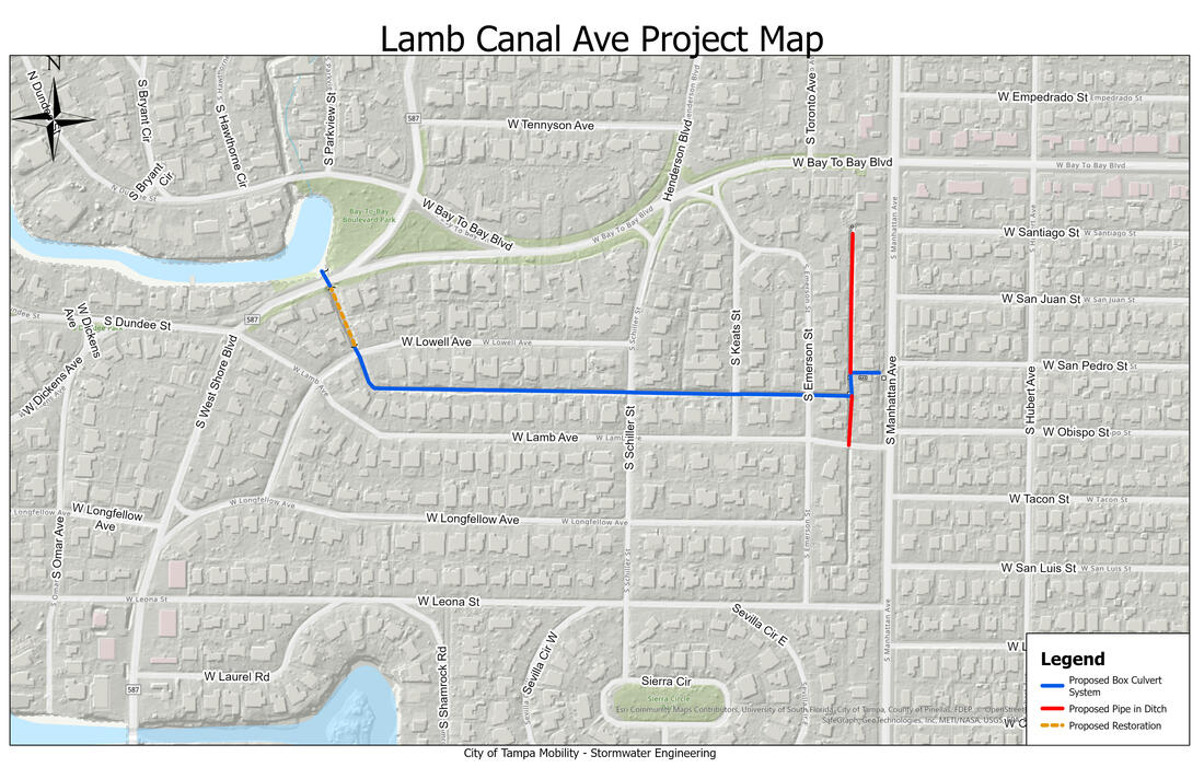 The Lamb Canal has experienced significant erosion over the years and is in need of rehabilitation. Embankment deterioration has reduced the canal’s capacity and increased the risk of further erosion.This project will remove accumulated sediment and stabilize the canal banks in targeted areas to prevent future erosion and help restore capacity. A future phase may include replacing and upsizing the drainage pipes at W. Bay to Bay Boulevard and S. Manhattan Avenue to help alleviate frequent nuisance flooding at the intersection.