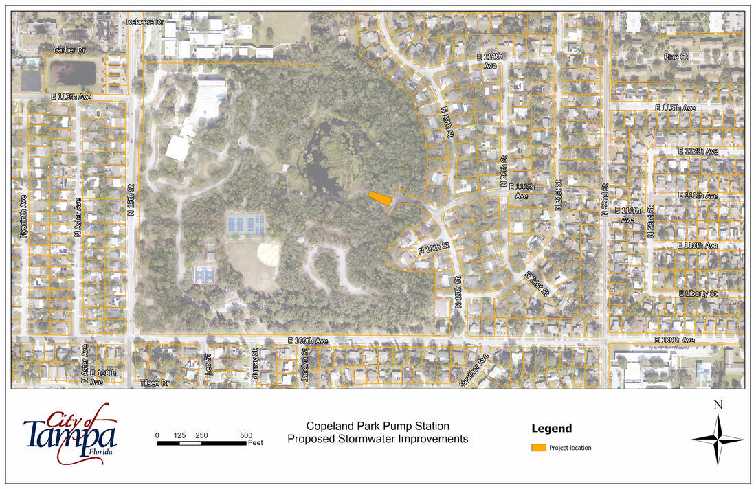 This project is to construct a stormwater pump station to address flooding conditions in Copeland Park. Currently, a temporary pump is utilized to drain the low-lying area. A permanent pump station is proposed to replace the need for a temporary pump. This station will be controlled remotely through the City’s SCADA system.