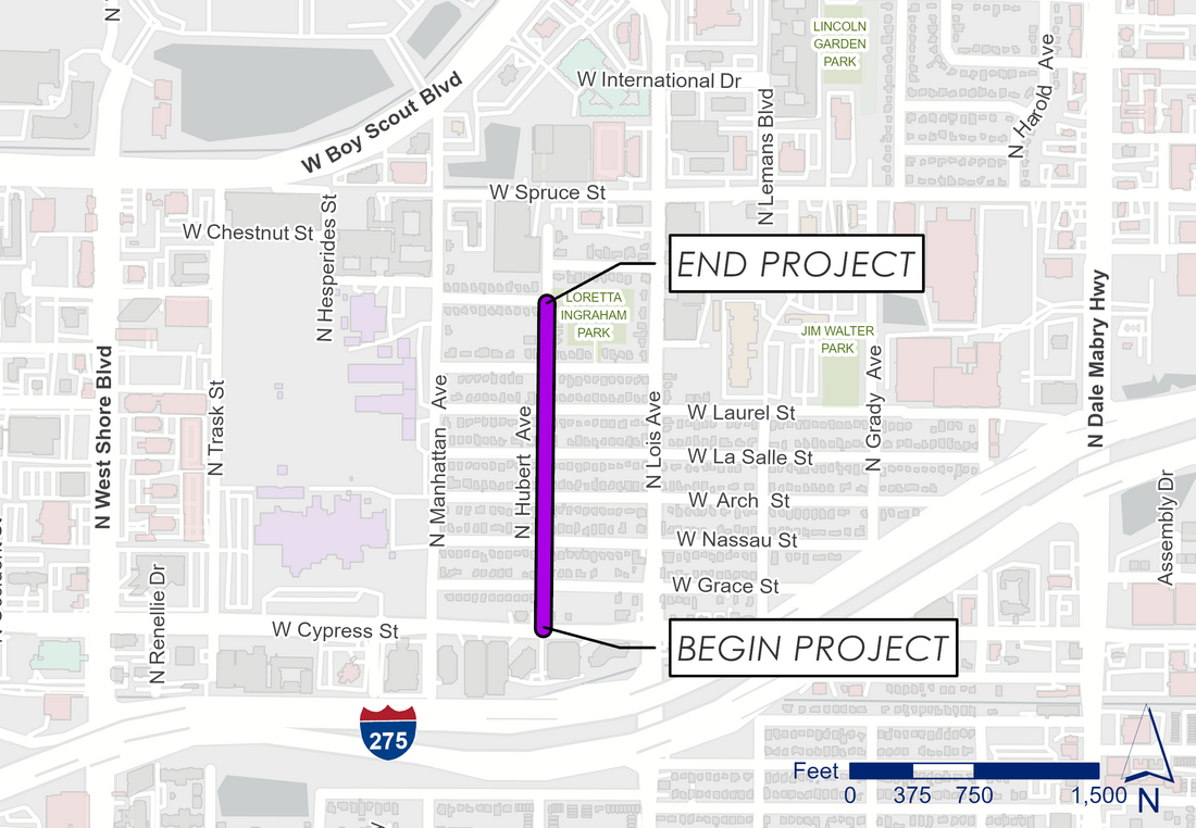 This project provides for a new sidewalk 2,000 feet in length and 5 feet in width along both sides of N Hubert Ave, extending from W Cypress St to W Main St, as well as filling any sidewalk gaps within that range. These improvements will contribute to increased school and pedestrian safety, multimodal network connection, and increased access to the local Loretta Ingraham Recreation Complex.