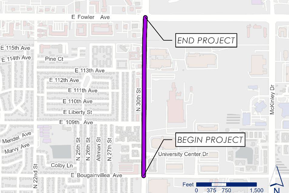 This project aims to improve transportation connections and safety measures along the 30th St corridor, spanning approximately 0.7 miles from Bougainvillea Ave. to Fowler Ave. This project has been recommended through the MPO and City's Walk/ Bike Plan, Phases I and II, and through the City’s Pavement Condition Index Assessment. The City is considering various enhancements including improved pedestrian crossing at the railroad, dedicated bicycle lanes, and road resurfacing.