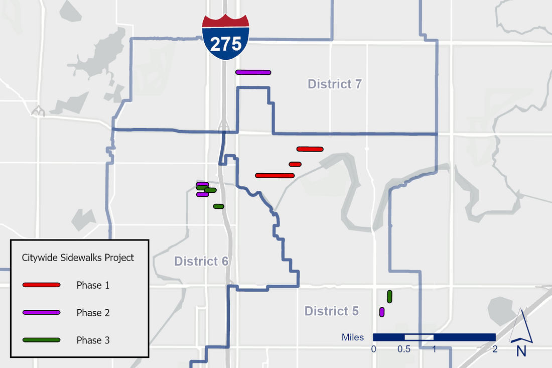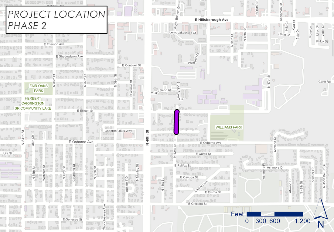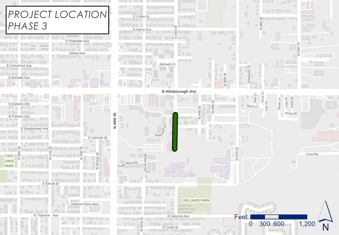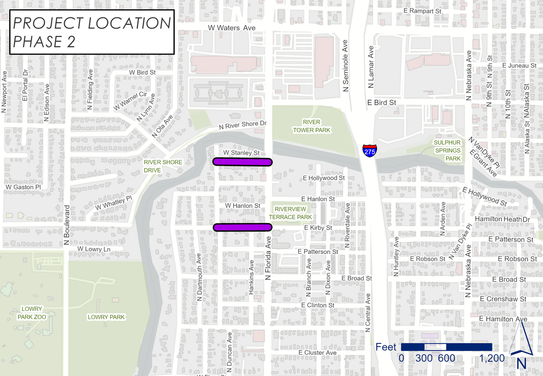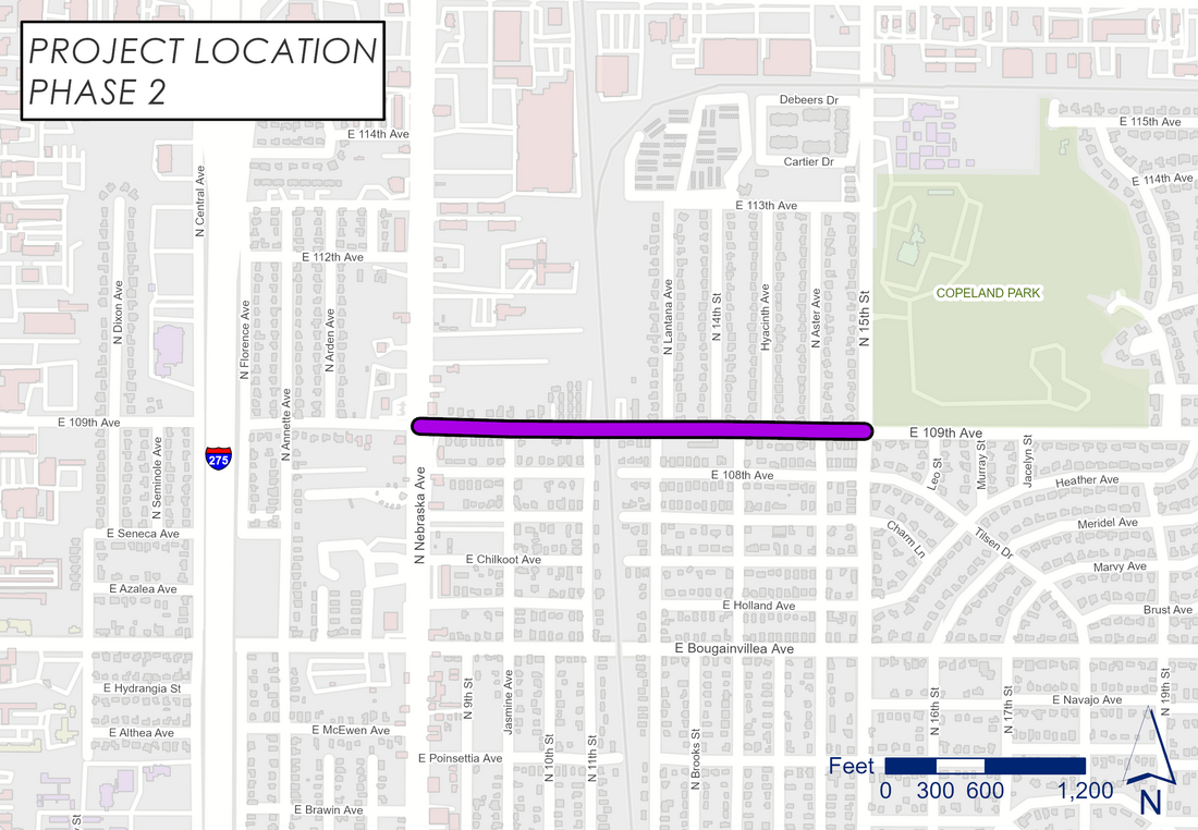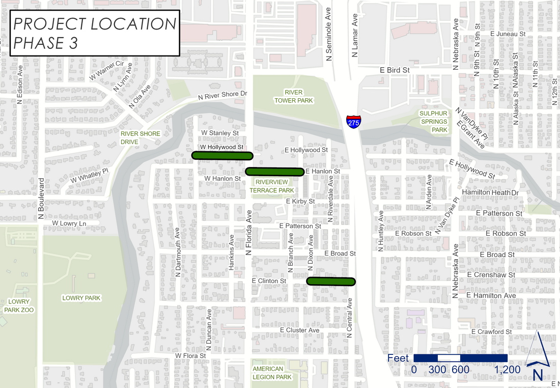The City has conducted an analysis of all sidewalk gaps, prioritizing them according to the Tampa MOVES criteria. The top-priority sidewalk gaps throughout the City that will be constructed under this project are, Phase 1: E. Waters, South side from Rowlett Park Dr to E Riverhills Dr; E Riverhills Dr/E Yukon St, South side from N 22nd St to N 28th St; and E Bird St, South side from N Klondyke St to N Ogontz Ave. Phase 2: E 109th Ave, North side from N Nebraska Ave to N 15th St; W Stanley Ave North and South Side from N Highland Ave to N Florida Ave; W Kirby St, North and South side from N Highland Ave to N Florida Ave; and N 42nd St, East side from E Louisiana Ave to E Ellicott St. Phase 3: W Hollywood St, North and south side from N Highland Ave to N Florida Ave; E Hanlon St, North and south side from N Florida Ave to N Branch Ave; E Clinton Ave, North and south side from N Dixon Ave to N Central Ave; and N 43rd St, East and west side from James Elementary School to E Frierson Ave.