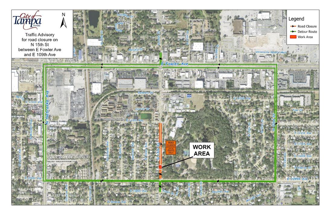 On May 29 at 9 am, Wastewater Department crews are closing N 15th St between E Fowler Ave and E 109th Ave to repair manholes in the area. Signage and traffic control devices will be on-site to assist with rerouting and traffic flow. Access will be maintained for residents and businesses in the area. Motorists are advised to consider alternate routes and use caution when driving in the area.