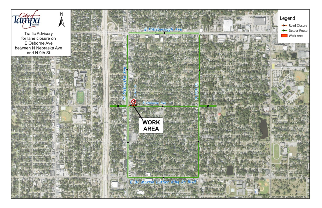 On June 10 at 9am, Wastewater Department crews are closing the westbound lane on E Osborne Ave between N Nebraska Ave and N 9th St to install a sewer lateral. Eastbound traffic will not be impacted. Signage and traffic control devices will be on site to assist with rerouting and traffic flow. Access will be maintained for residents and businesses in the area. Motorists are advised to consider alternate routes and use caution when driving in the area.