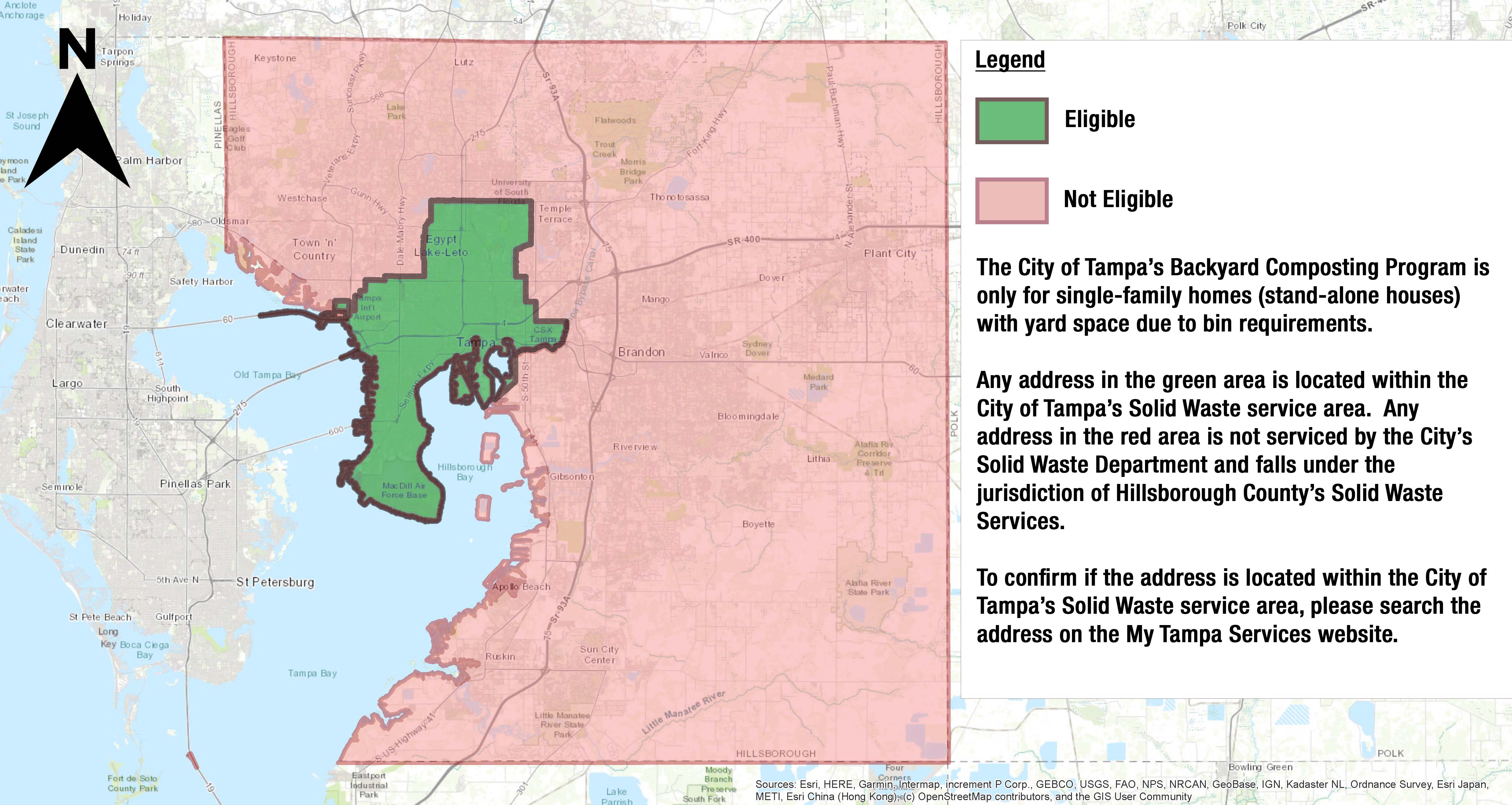Residents within the City of Tampa’s Solid Waste service area, as pictured below, who have an active solid waste account are eligible to take a free composting workshop. Upon completion of all the required steps outlined during the workshop, residents will then be able to receive a free backyard composting bin. Before registering please verify eligibility using the City Limits Map.