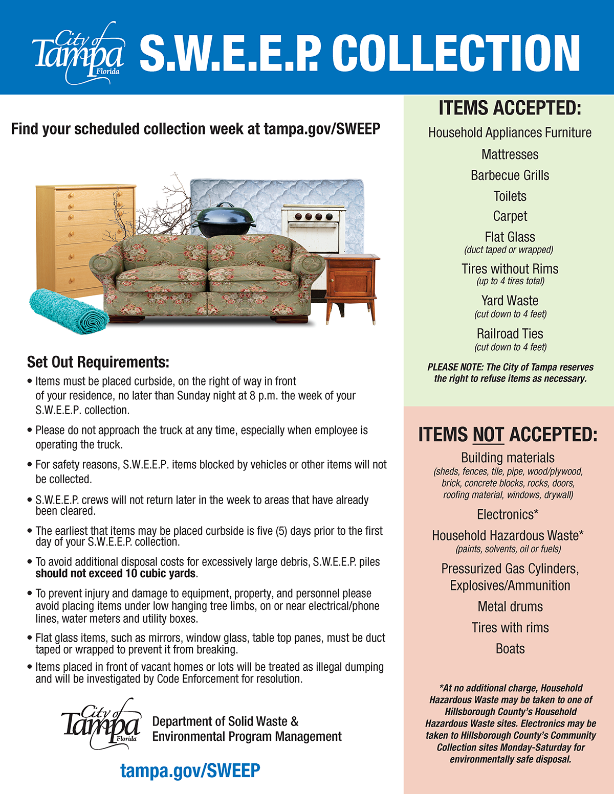 * S.W.E.E.P. collections are not provided in New Tampa as New Tampa residents are serviced by Hillsborough County Waste Management. New Tampa residents are encouraged to contact Hillsborough County Waste Management at (813)-272-5680 or visit www.HCFLGOV.net/Trash for more information about their solid waste services and how to properly dispose of bulky waste.