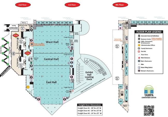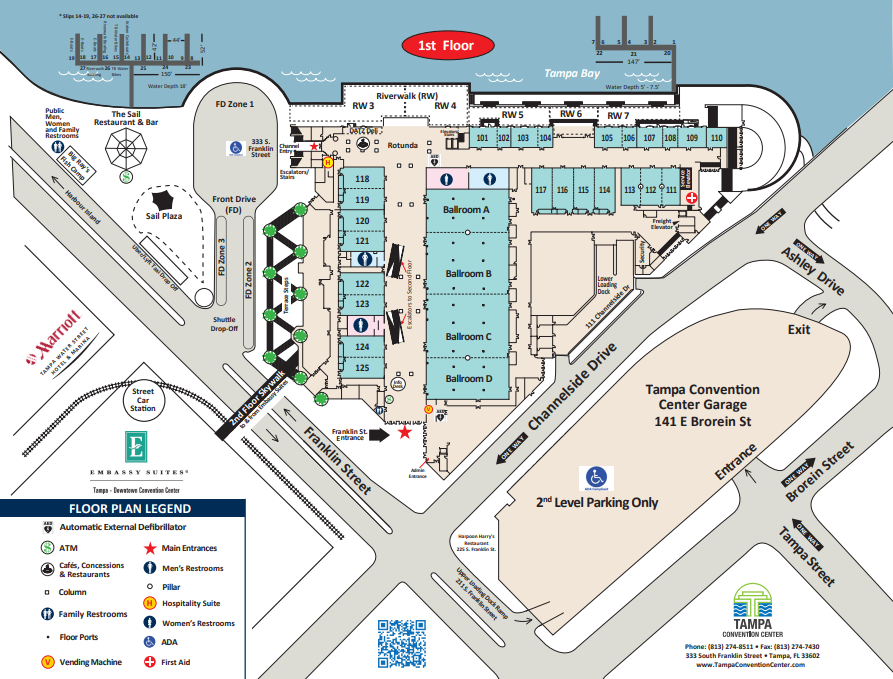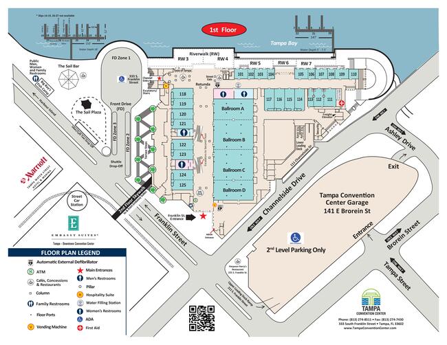 The Tampa Convention Center is located along the Riverwalk in the heart of downtown Tampa. The facility is comprised of 600,000 square feet with four floors and outdoor spaces as follows: