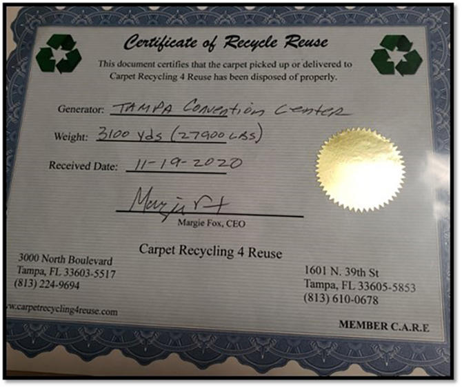 TCC recently completed a $1 million renovation of its Ballrooms, which included new carpeting. As part of our sustainability measures, 28,000 lbs of the former Ballroom carpet was recycled. TCC is in the process of renovating our meeting rooms, which will involve additional carpet recycling in the coming weeks.