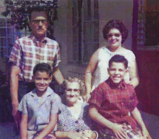 My grandfather, Manuel Martinez Sr., grandmother Amada Martinez,  uncle, Jorge Martinez, great-grandmother, Nicasia Crespo, and dad, Manuel Martinez Jr. at Robles Park Village, just a few months after they fled Cuba.