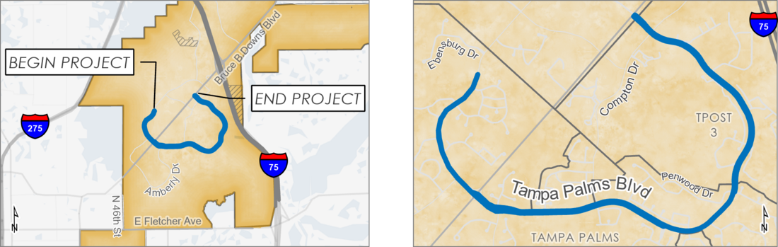 The City of Tampa Mobility Department is working to design the Tampa Palms Boulevard Complete Streets Project. Corridor-wide maintenance, operational, multi-modal, safety, and traffic calming are included in the scope of the planned improvements. Roadway improvements for the 4-mile loop incorporate upgrades to pedestrian facilities, traffic calming elements, reduced posted speeds, as well as pavement resurfacing. Details are as follows: