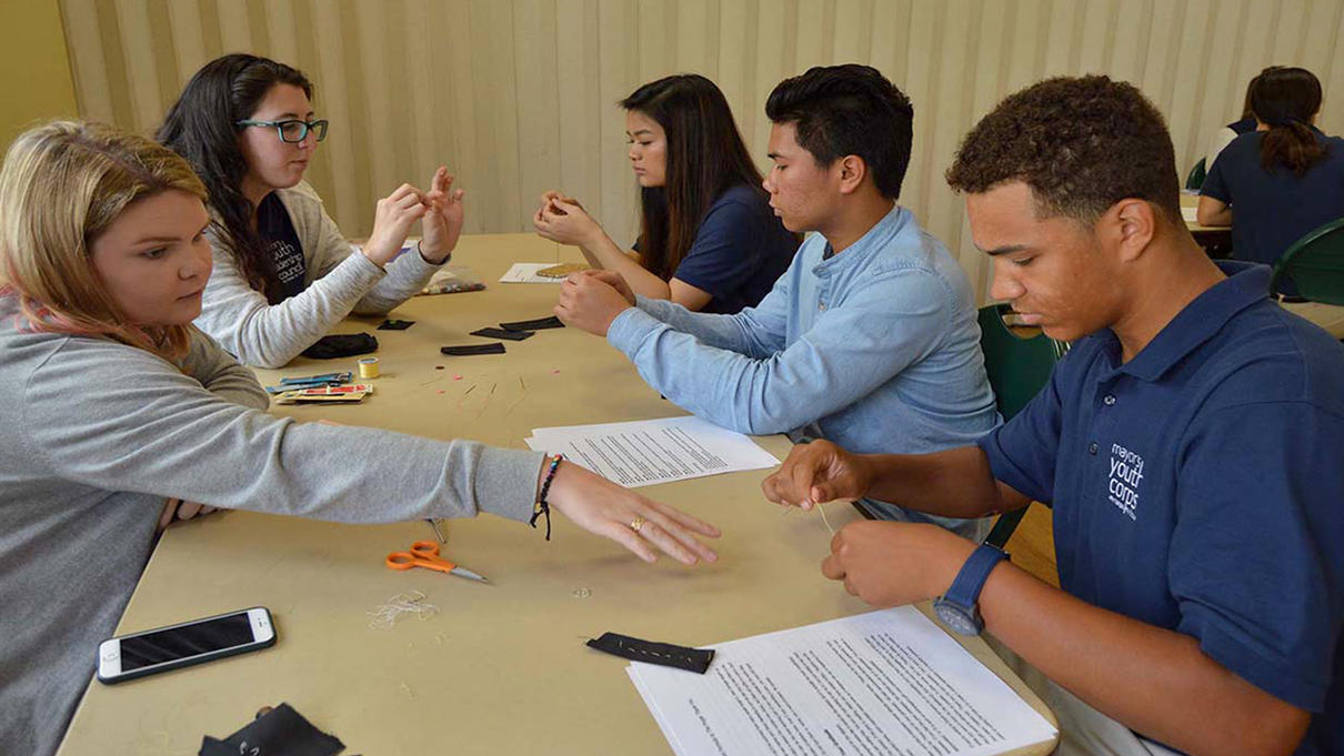 MYC members attentively practice sewing and a variety of other essential life skills at a Leadership 101